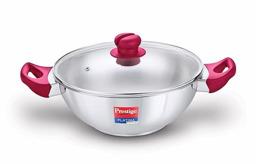 Prestige Platina Popular Stainless Steel Gas and Induction Compatible Kadai with Glass Lid, 220 mm
