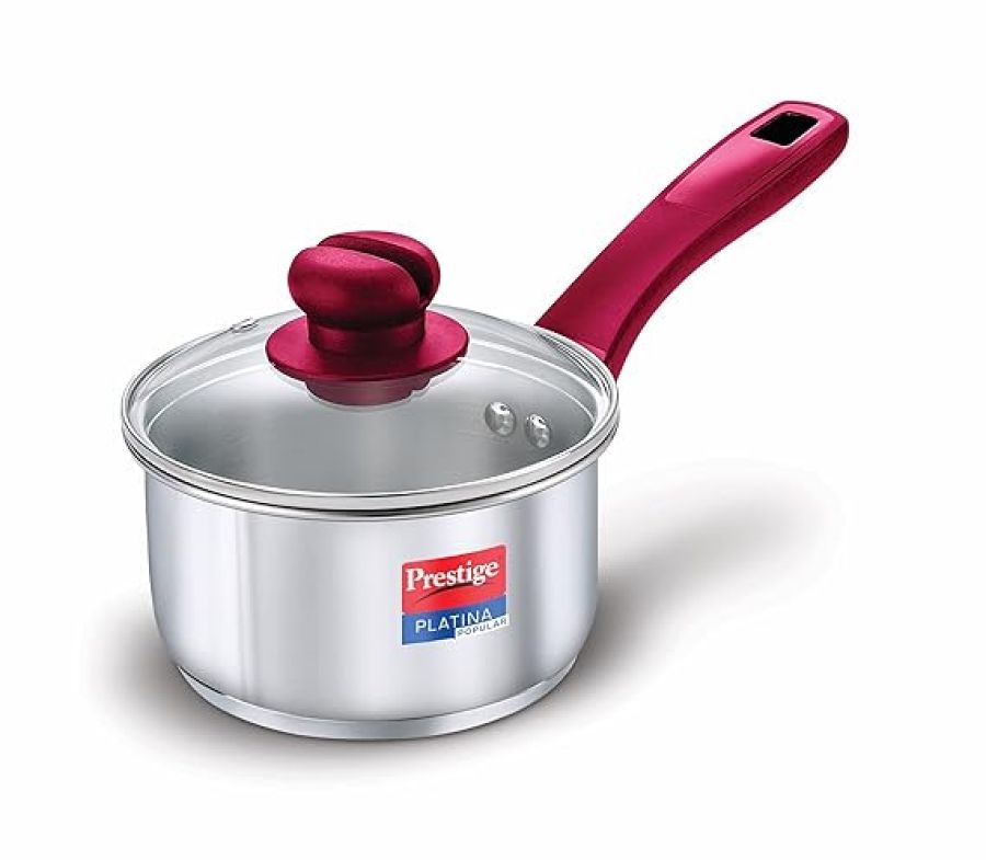 Prestige Platina Popular Stainless Steel Gas and Induction Compatible Sauce Pan with Glass Lid, 140 mm