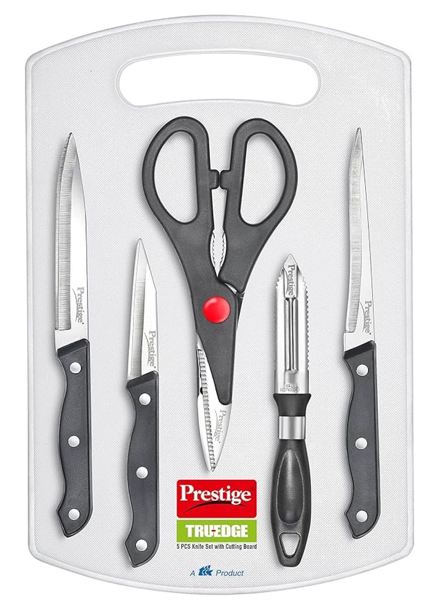 About this item 1 Unit of Prestige TRUEDGE Knide set (Consisting of Utility Knife- 1 U, Paring Knife- 1U, Vegitable Knife- 1 U, Scissor- 1 U, Peeler- 1 U and Cutting Board- 1 U) Single piece of stainless-steel blade with riveted handles. High quality sharpening. Superior surface finish. Tempered steel.